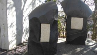 埼玉県平和資料館入口前に原爆投下時、旧広島市役所正面玄関前敷石を見つけました。 屹立(きつりつ) パネル